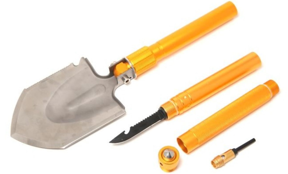 Un modèle multifonctionnel à utiliser par les automobilistes dans diverses situations lors de la conduite hors route ou en hiver pour sortir une voiture des congères. Un ensemble avec trois poignées d'extension vous permet de l'utiliser en plus comme hache, scie, ouvre-boîte, marteau de sauvetage, sifflet, couteau tactique et aussi une tige de magnésium.