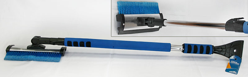 La brosse à badigeonner a une conception télescopique. Il est idéal pour déneiger les grands VUS et les minibus. La longueur du manche est réglable de 98 à 145 cm, c'est un chiffre très impressionnant. À l'aide de la tête rotative, l'utilisateur peut régler la direction de la pièce de travail.