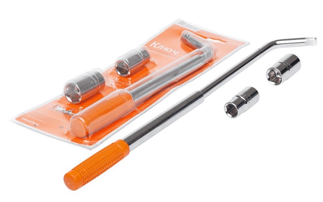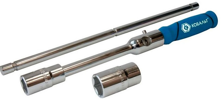 Le collier est semblable à une clé en forme de L et est une poignée en métal avec un carré d'atterrissage sous la tête. Il peut avoir un mécanisme de charnière d'extrémité. dans ce cas, le même composant réactif n'est pas exclu, mais uniquement pour les jantes en alliage léger. Lorsque vous les utilisez, vous devez également acheter une tête d'extrémité de taille appropriée. Les clés télescopiques sont également similaires aux outils en forme de L, mais diffèrent par une poignée extensible. L'ensemble est généralement équipé d'une tête double face pour deux tailles adjacentes - 17 et 19 ou 21 et 23 mm. Grâce au bras allongé, vous pouvez obtenir un moment supérieur à celui d'un G-ballon conventionnel.