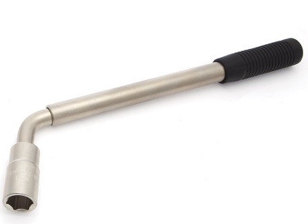 Les plus courantes sont les clés en forme de L (sinon on peut les appeler en forme de L). Lors de leur manipulation, l'automobiliste risque de rencontrer un élément réactif non compensé, qui tend à arracher la clé des attaches, dans une telle situation on peut se blesser. La longueur du genou axial de la tête est importante ici, plus simplement, c'est la taille de la ligne horizontale de la lettre G (ou L). Le paramètre nommé ne doit pas être très petit: le but de la tête est de saisir les attaches, tandis que la main posée sur la poignée ne doit pas toucher la molette. Plus la partie verticale est longue, plus il est facile de dévisser le boulon ou l'écrou. Mais une poignée trop longue peut toucher le sol ou l'asphalte lorsque vous essayez de faire pivoter rapidement les fixations libérées.