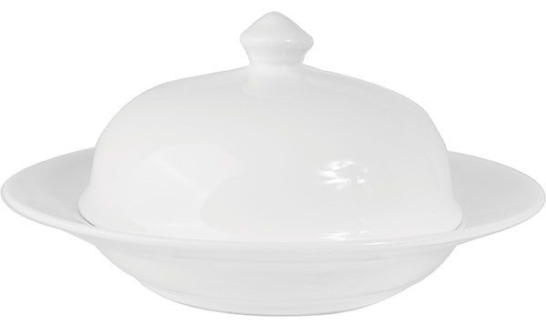Service en porcelaine élégant composé d'une assiette et d'un couvercle.La vaisselle est de couleur blanche, elle s'intégrera donc dans n'importe quel intérieur. Grâce au bord haut de l'assiette, les plats peuvent être utilisés pour servir des entrées et des plats principaux.