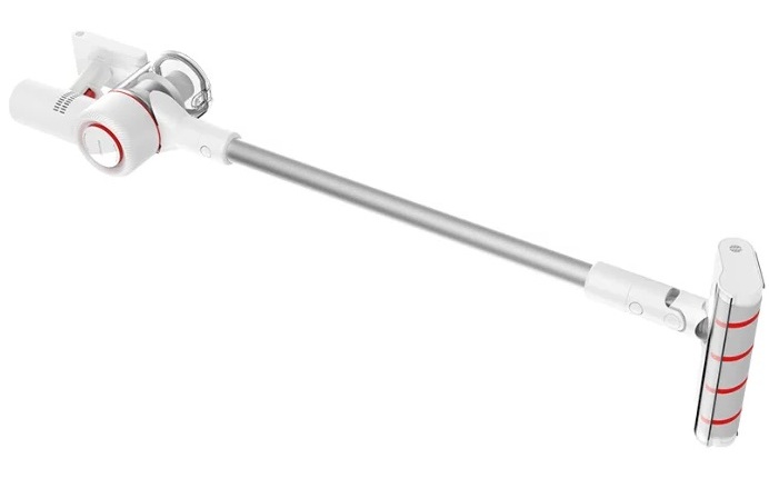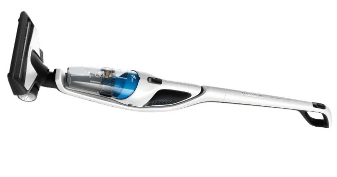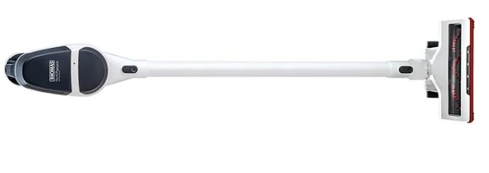 L'aspirateur sans sac avec filtre fin fonctionne sur batterie. La commande de puissance est sur la poignée. Le corps est blanc avec des accents rouges. Il y a deux buses dans le kit : crevasses, combinées. La surface de travail est une brosse avec un rouleau. La poignée peut être détachée pour un rangement compact.