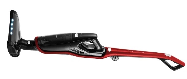 Aspirateur domestique dans une solution rouge et noire, équipé d'une lumière ultraviolette sur la surface de travail, qui vous permet de balayer plus en profondeur le sol à la recherche de saleté. Il y a un bouton de réglage de puissance sur la poignée. Le tuyau d'échappement est d'une seule pièce. L'ensemble se compose d'un filtre fin et d'une brosse électrique, qui peuvent être rangés dans un compartiment spécial situé sur la poignée de l'aspirateur.