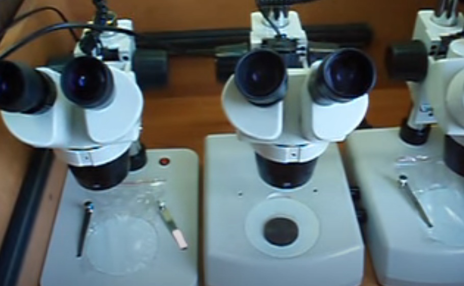 Un appareil stéréoscopique sur une pince d'un fabricant allemand est utilisé dans l'étude du matériau volumétrique par le type de lumière réfléchie.