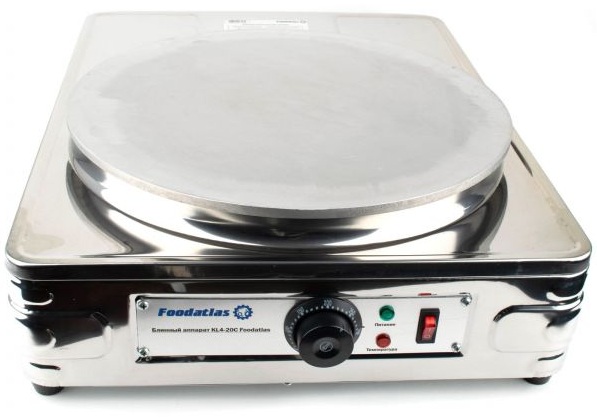 La crêpière, alimentée au gaz, est en acier inoxydable. Commutateurs rotatifs - thermostats, plastique avec bordure bleue. La surface de travail est lisse, nécessite un soin particulier, ne permet pas à la pâte de coller lors de la friture des crêpes.