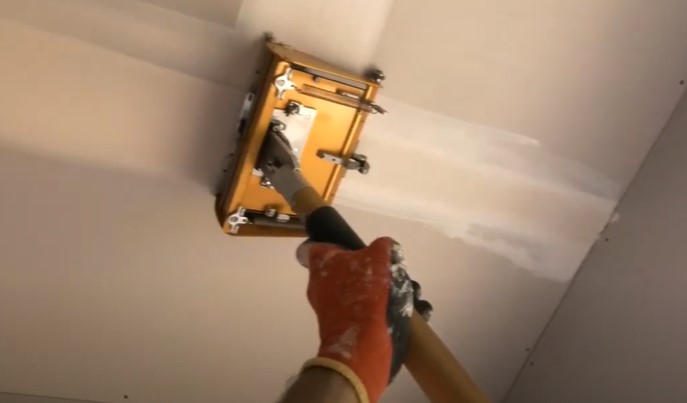 - L'escabeau s'estompe également à l'arrière-plan, car la boîte à mastic a une poignée d'extension. Il n'est plus nécessaire de monter haut pour finir le plafond.