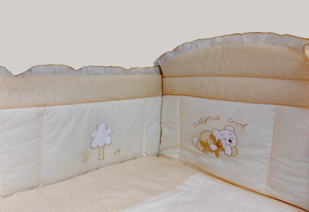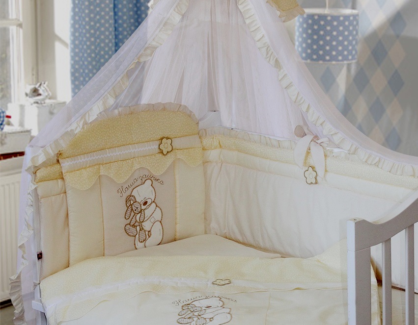 Le produit est fabriqué en Russie. Les parents pensent que ce modèle est l'un des meilleurs. Se compose de sections. Remplissage - hollowfiber. Fabriqué à partir de tissu satiné de haute qualité. Il est acheté pour des lits avec des paramètres de 120 * 60 cm Couleur - beige, design - détendu. Hauteur - 42 cm Fixation - cordes. La photo montre une belle maison rustique en bois. Il y a de la broderie et de la dentelle. La couverture est épaisse, en coton. Il est vendu dans n'importe quel point de vente spécialisé.
