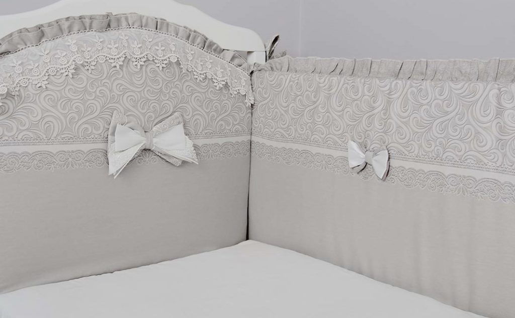 Un produit d'un fabricant national à un prix abordable. Il est très apprécié des connaisseurs de produits de haute qualité et sûrs. Les pare-chocs ne permettront pas au bébé de se blesser sur la balustrade en bois en tombant. Les courants d'air et la poussière contournent le berceau. Matériel de production - calicot grossier. Remplissage - hollowfiber. La durée de vie est assez longue, sans perdre l'aspect d'origine. Les coins de la couverture sont munis d'un ruban de satin. Il faut bien les nouer.