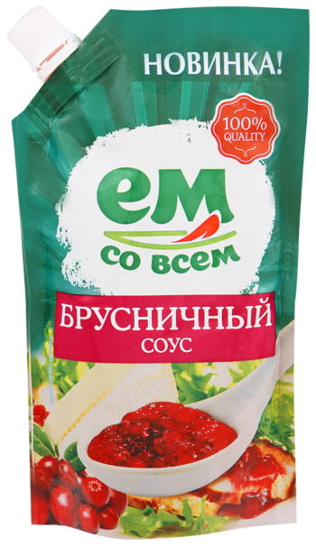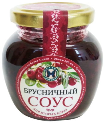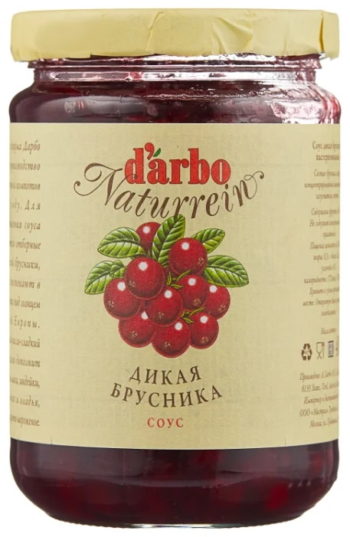 Un produit polyvalent adapté à toute viande, volaille ou plat d'accompagnement, fabriqué dans la région de Leningrad. Texture épaisse avec un agréable arôme de baies du nord et un léger goût acidulé. Sur l'étiquette des informations pour le consommateur. La composition est simple et comprend des airelles rouges, du sucre, de l'eau potable, de l'acide citrique - un régulateur d'acidité, de l'amidon de maïs, de la noix de muscade et du piment de la Jamaïque. Cependant, ce n'était pas sans conservateur - sorbate de potassium et pectine - un épaississant.