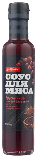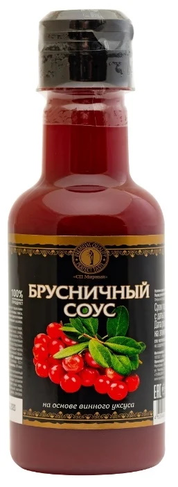 Produit de fabrication russe aigre-doux avec un arrière-goût caractéristique d'airelle rouge. Un excellent ajout aux plats de volaille à petit prix. Il se compose principalement d'ingrédients naturels : baies surgelées, jus concentrés d'airelle et de pomme, sucre, mélasse, acide citrique, arôme naturel et eau potable. Le poivre blanc moulu donne à la sauce un goût particulier. Pas sans additifs artificiels - épaississant d'amidon E1442 et conservateur E202.Selon le fabricant, des traces de transformation du lait, de soja, de sésame, de moutarde et d'œufs peuvent être présentes dans la sauce.