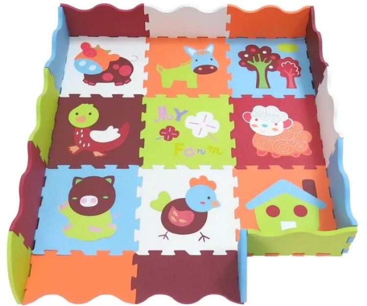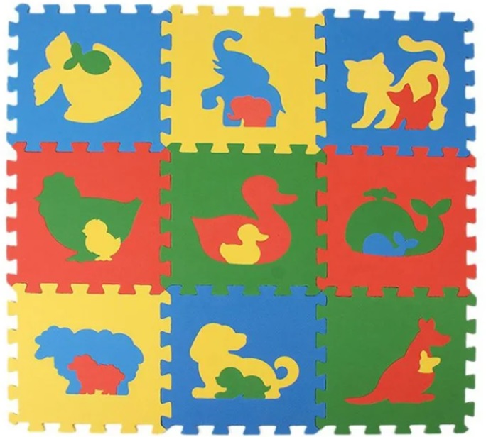 Le tapis est destiné à l'enfant de 1 an. Il protège non seulement le bébé des blessures accidentelles, mais contribue également à son développement mental. Les carrés multicolores vous aideront à apprendre les couleurs de base. La photo montre clairement que dans chaque secteur il y a un insert en forme d'animal. Il peut être retiré et donné au bébé à assembler pour le développement de la motricité fine des doigts et pour l'étude des animaux domestiques.