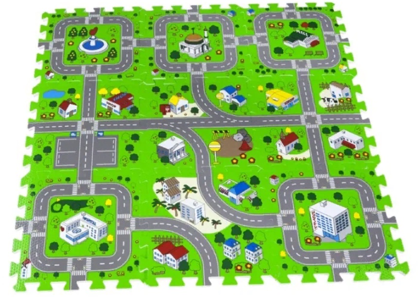 La popularité du modèle est associée à la large fonctionnalité du produit. Les éléments du tapis sont pliés et forment un espace de jeu unique avec toute la ville - autoroutes, maisons, transports. Selon la description, un tel produit peut devenir une décoration pour une salle de jeux et captiver un enfant avec de nombreux jeux. L'enfant développe l'imagination, les compétences de jeu, la motricité fine. Le coût de la couverture est de 1276 roubles.