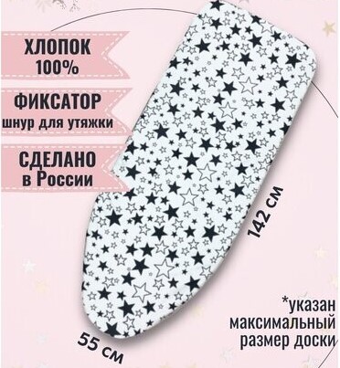 Le modèle peut être utilisé pour toutes les planches à repasser de dimensions similaires. La doublure est en feutre, la partie avant est en coton. Il y a un cordon de serrage pratique. Il fixe efficacement le tissu, offre la couverture la plus lisse. Dimensions : 120x45 cm Coût : 4500 roubles.
