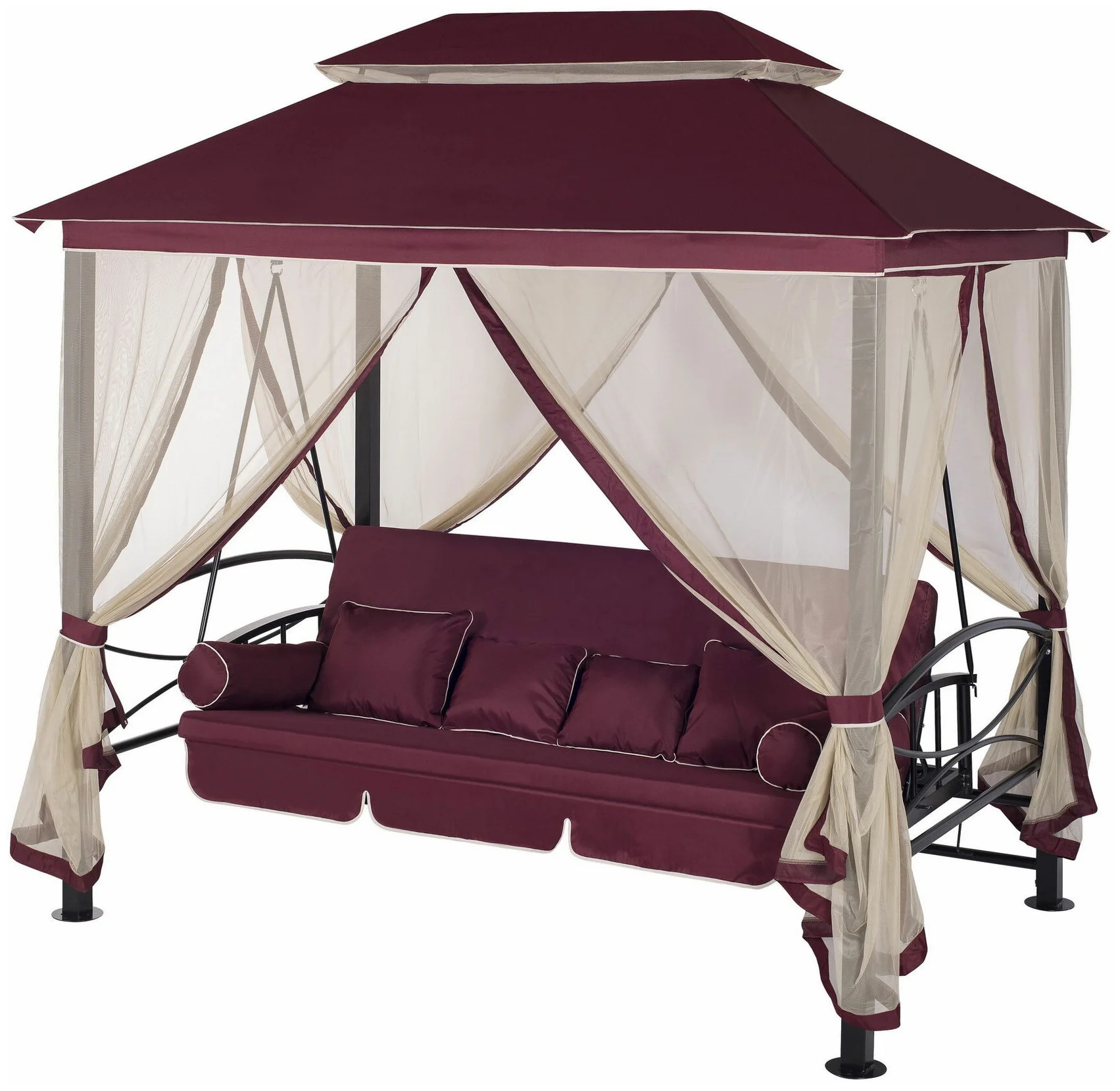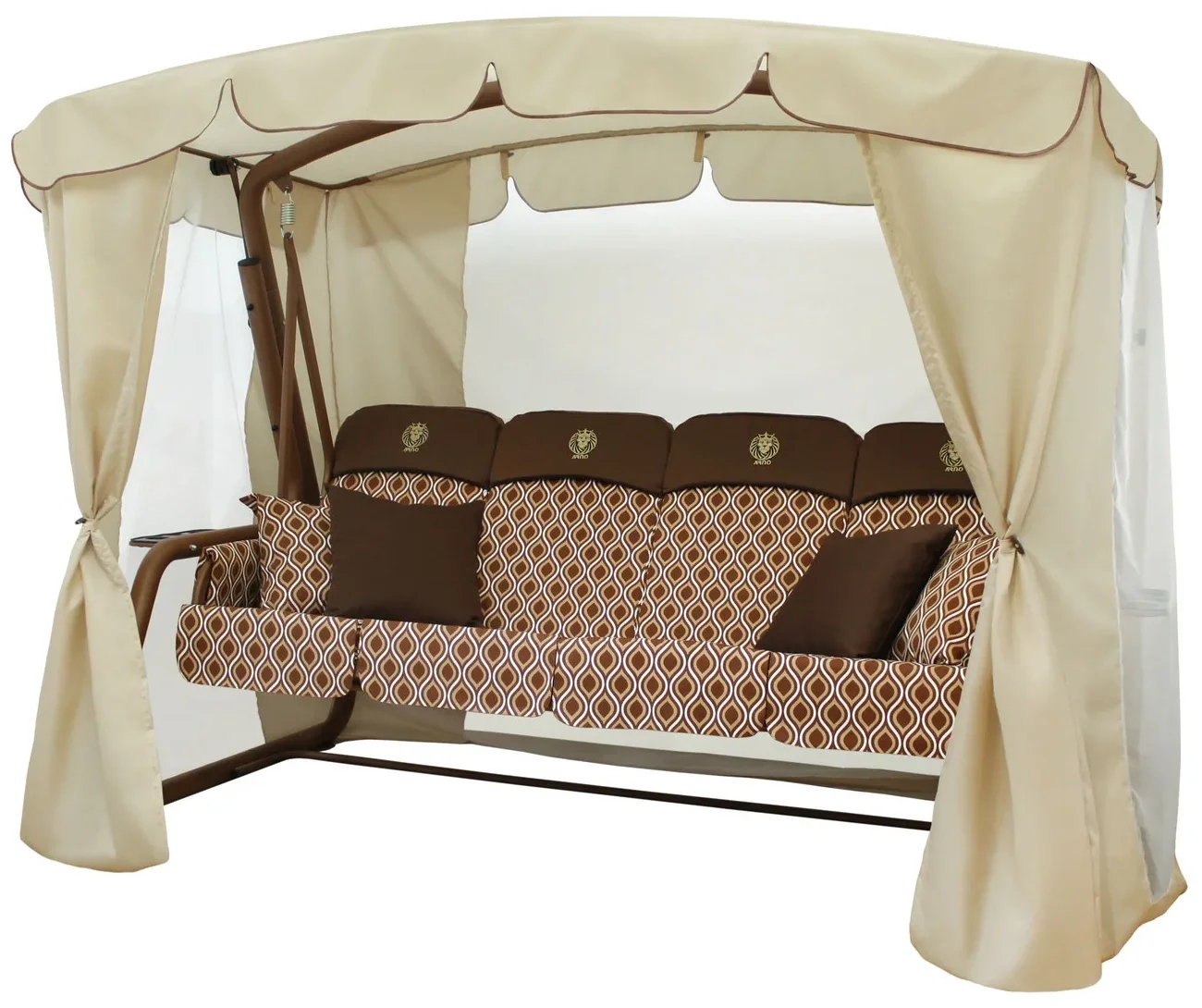 Ce modèle de style palace a l'air très cher. La base en tube d'acier solide mesure 76 mm. Les meubles de jardin sont durables et fiables. Résiste à un poids maximum de 500 kg. La base a un large toit voûté. Il protège parfaitement de la pluie et du soleil.