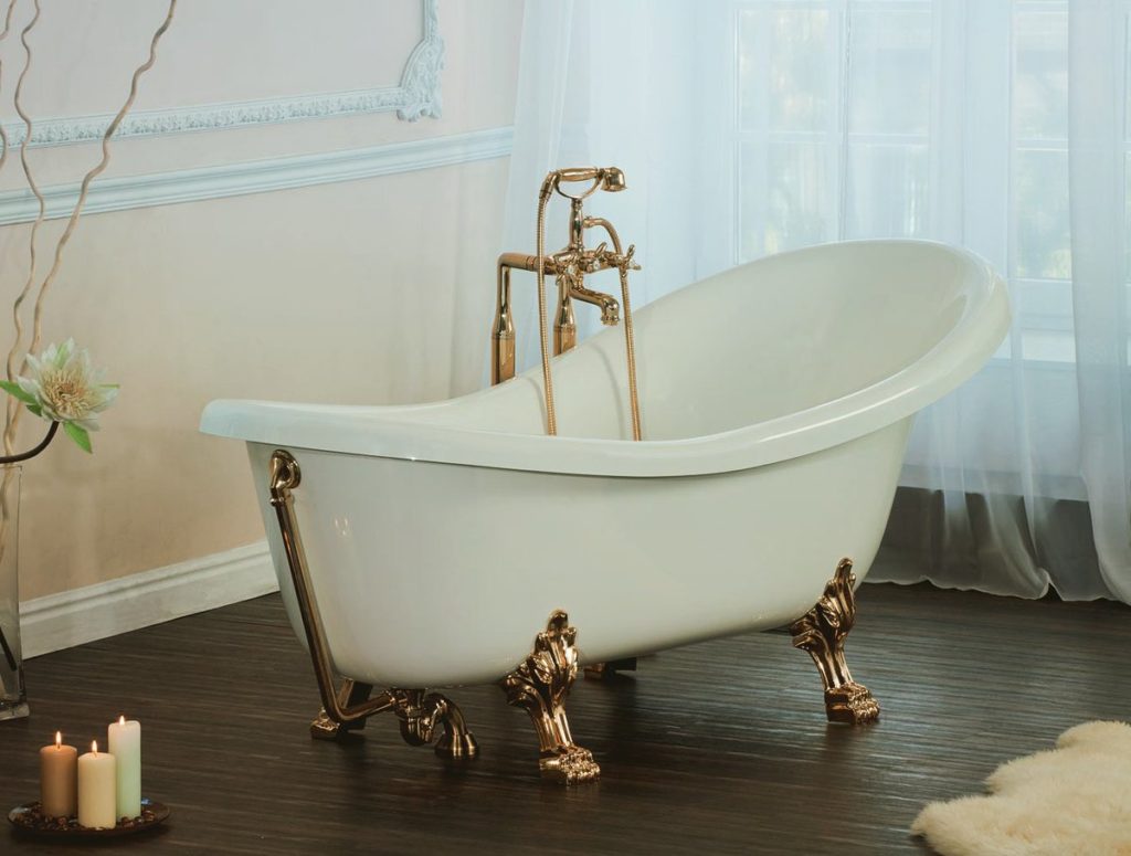 Le produit est équipé de pieds de bonne qualité, ce qui lui permet de supporter de lourdes charges. Un tel bain peut être utilisé par des personnes de tout teint. La gravure spéciale des jambes donne un luxe particulier. Les couleurs de cette finition sont le bronze argenté et l'or. La baignoire est conçue pour les pièces spacieuses, car elle est structurellement conçue pour se tenir individuellement.