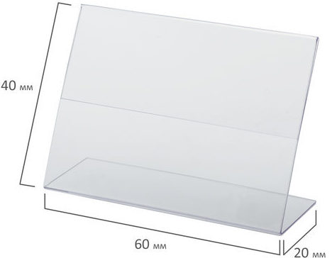Le fabricant russe Brauberg produit un grand nombre de supports pour les prix, le modèle 60x40 mm est le plus courant chez les consommateurs. Le support de table a un design stable et pratique, fabriqué en plexiglas fin et transparent. Vendu par lot de 25, l'insert d'information tarifaire peut mesurer jusqu'à 1,5 mm d'épaisseur.