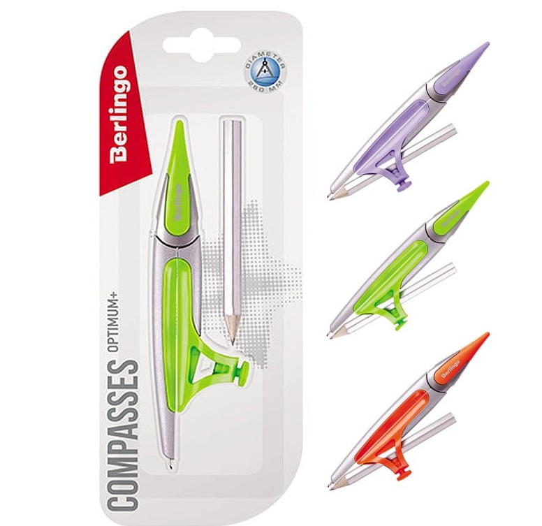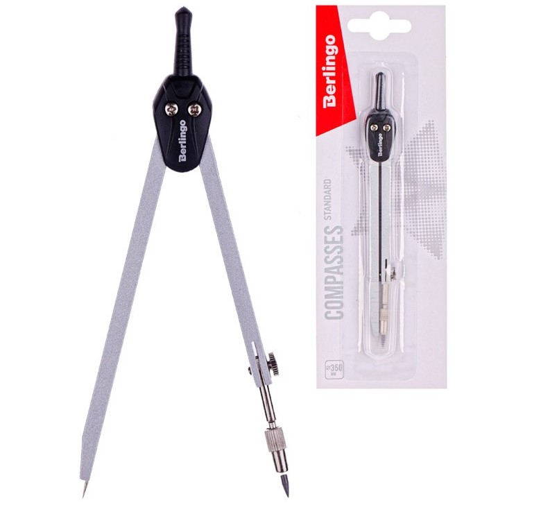 La société internationale Berlingo produit des boussoles confortables pour les écoliers et les dessinateurs professionnels. La longueur de l'outil est de 13,5 cm et le cercle maximum pouvant être tracé est de 35 cm.