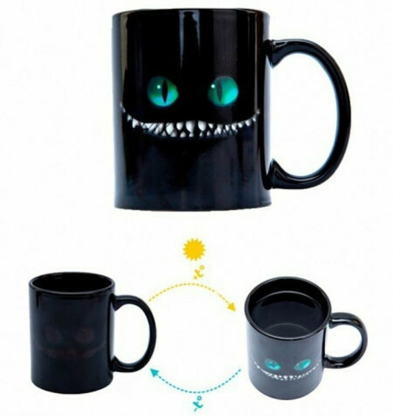 Une tasse noire ordinaire faite de matériaux sûrs se transforme sous l'influence de la température chaude (lorsque vous y versez du thé ou du café) - une image apparaît à la surface, ou plutôt le sourire d'un chat du Cheshire. Une fois la céramique refroidie, le chat, selon les lois du miroir, disparaît.