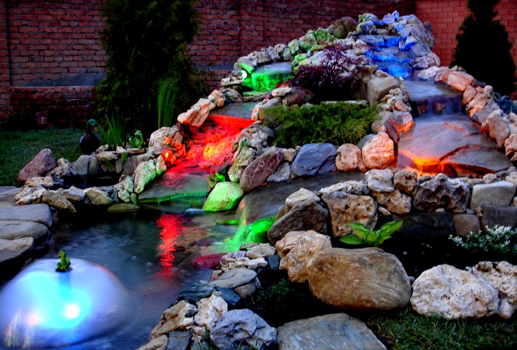L'éclairage joue un rôle important. Il donne du charme au design, surtout la nuit. En règle générale, les ampoules sont montées dans l'eau. Il existe des vues statiques et des vues dynamiques multicolores. Pour les amateurs d'extraordinaire, vous pouvez choisir un produit avec des effets spéciaux, par exemple avec une musique en couleur.