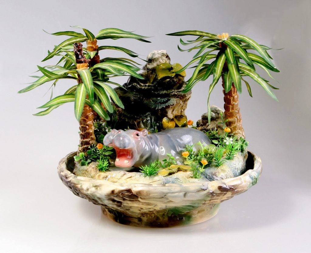 La fontaine compacte pour la maison est plus amusante que sérieuse. L'exposition comprend trois palmiers et un hippopotame sur fond de rocher. Dimensions : 36*42*42 cm, poids - 9 kg. Le fabricant fabrique des produits en porcelaine noble respectueuse de l'environnement. Sa sécurité est garantie par un certificat de qualité. Un cadeau original pour la jeune génération, amoureux de la nature, connaisseurs de la beauté.