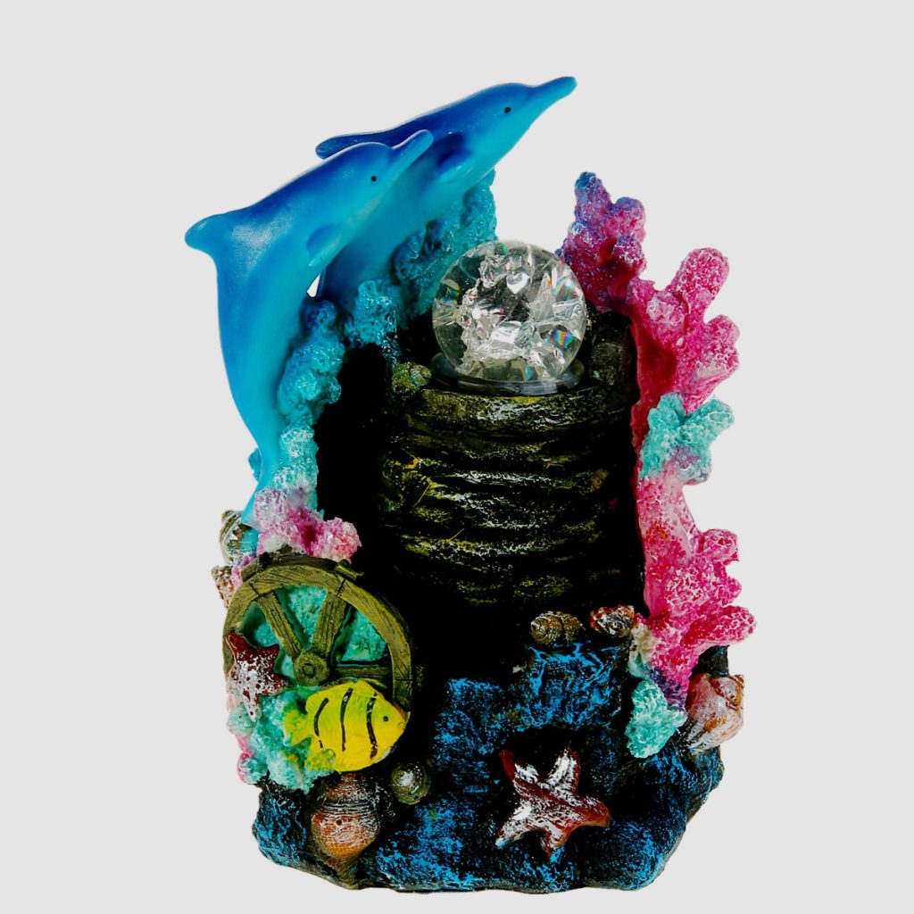 Le modèle de bureau est réalisé sous la forme d'un corail. Se distingue par ses petites dimensions (50*30 cm) et son raffinement. Il ne prend pas beaucoup d'espace libre, il n'y a donc aucun problème à l'installer même dans une petite pièce. L'éclairage et le brouillard ajoutent un charme particulier. Des coquillages et de la verdure artificielle servaient de décor.
