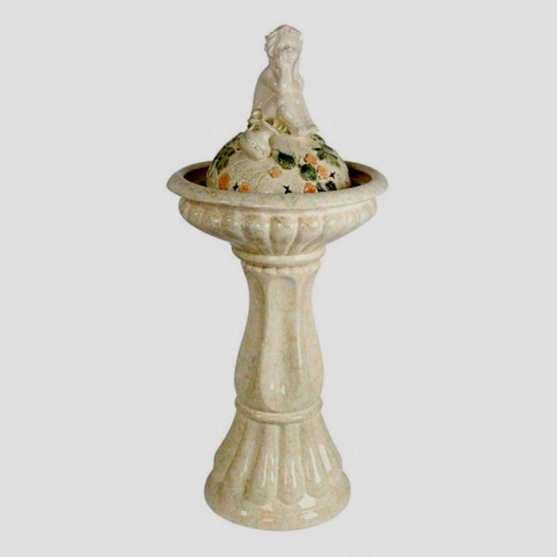 Sculpture d'un garçon assis sur un ballon. Le produit en porcelaine ne pèse que 19 kg. Toutes les étapes du travail, telles que le coulage, l'assemblage et la peinture, sont effectuées manuellement. L'eau qui s'écoule de la cruche coule à la surface de la boule, qui a une pompe pour faire circuler le liquide. Le réglage d'une pression d'un jet est fourni.