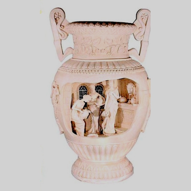 Malgré la hauteur importante (65 cm), il est d'usage d'installer la structure sur une table. La fontaine est recouverte d'une glaçure blanc-laiteux. Deux colombes se perchent sur une colline et roucoulent doucement. L'eau prend sa source dans la partie supérieure de la boule, où se trouvent les personnages, et à travers de minces tubes métalliques s'écoule d'abord dans un petit bol, puis dans un grand. Décoration spectaculaire de la table de mariage.