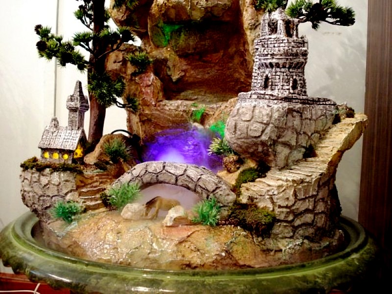 | Bureau | Une caractéristique distinctive est la petite taille et le prix raisonnable. Mais les fabricants produisent des modèles qui atteignent un mètre de hauteur. Fondamentalement, ils sont placés dans des pots de fleurs en céramique ou en polyéthylène, ennoblis de fleurs et de mousse, un bonsaï est installé à proximité ou des pierres sont disposées. En règle générale, ils sont vendus avec rétro-éclairage. Équipé d'une pompe silencieuse. |