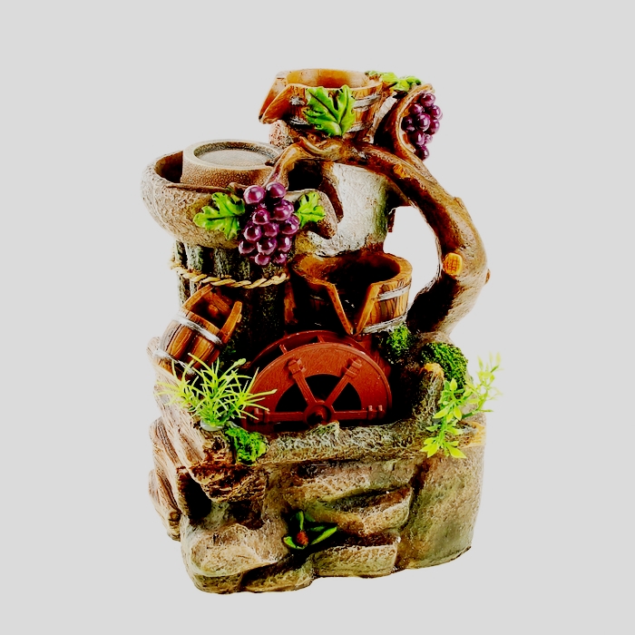L'eau s'écoule en deux flux : l'un sur la roue, qui commence à tourner sous pression, l'autre depuis la cruche. Vous pouvez commander un produit avec un brouillard coloré ou placer un animal à côté, par exemple un éléphant.