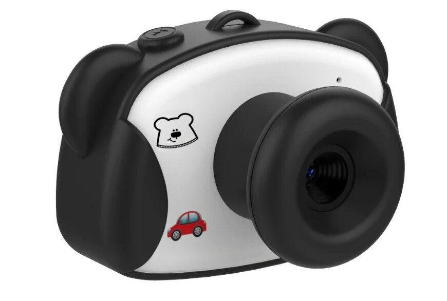 Fabriqué par Lumicube (Chine) en forme d'appareil photo traditionnel. La couverture est le museau d'un ours. Couleur de l'appareil photo - blanc, objectif et couvercle amovible - noir, rose.