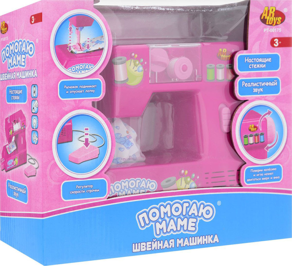 Dans la gamme de la marque ABtoys "Helping Mom", il existe plusieurs modèles différents de machines à coudre pour enfants, qui sont conçues pour différents âges et se différencient par leur fonctionnalité et leur design. Sur ce modèle de machine à coudre électromécanique, conçu pour les filles de 4 à 6 ans, il est tout à fait possible de coudre plus d'une tenue de poupée. Il a un levier pour lever et abaisser le pied, comme de vrais modèles, et lorsqu'il est allumé, le son d'une machine à coudre en marche se fait entendre.