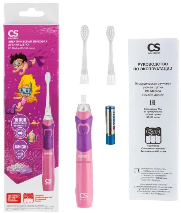 Brosse à dents électrique pour enfants de 5 à 12 ans. Il a deux versions : pour les garçons - en bleu avec l'image d'un transformateur, pour les filles - en rose avec l'image d'une fée. Design laconique sans détails inutiles. Fonctionne avec deux piles AAA. Remplacement de buse disponible.