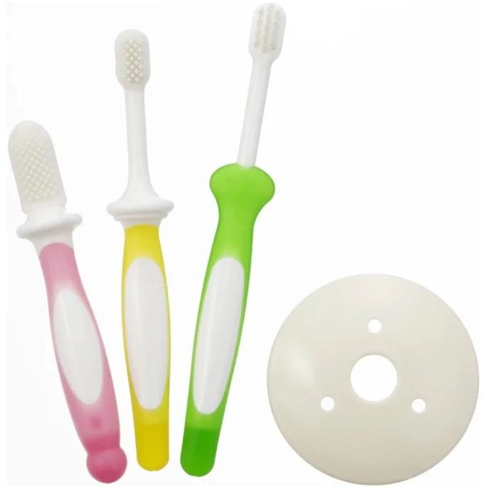 Cette option du fabricant japonais est un ensemble de 3 brosses destinées aux différents âges de l'enfant. L'application est recommandée à partir de la dentition jusqu'à 3 ans. Cet ensemble vous permet d'apprendre à votre bébé à l'hygiène bucco-dentaire étape par étape. La première brosse de l'ensemble (rose) aide l'enfant à soulager l'inconfort lors de la dentition et à s'habituer à la nécessité d'une hygiène bucco-dentaire. Les poils en caoutchouc double face sont doux, les poils sont de longueurs différentes et plus fins vers la fin. Le second (jaune) est recommandé pour une utilisation après l'apparition des dents de devant. Le poil est en silicone unilatéral. Le troisième (vert) est destiné aux enfants de plus d'un an. Il est conçu pour apprendre aux enfants à se brosser les dents eux-mêmes. Les poils sont déjà en matériau ordinaire.
