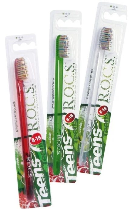 Pinceau de la série Teens de la société russe R.O.C.S. Conçu pour les enfants et adolescents de 8 à 18 ans. Il est présenté en 3 options de couleur : transparent, vert et rouge. Mais surtout, cet outil se distingue des autres produits similaires par une coupe spéciale des poils : raccourcis vers la fin, ils permettent d'atteindre les dents éloignées et de les nettoyer efficacement de la plaque dentaire. Les poils des poils sont également différents.Ils ont des pointes arrondies polies qui ne blessent pas les gencives délicates et l'émail sensible.