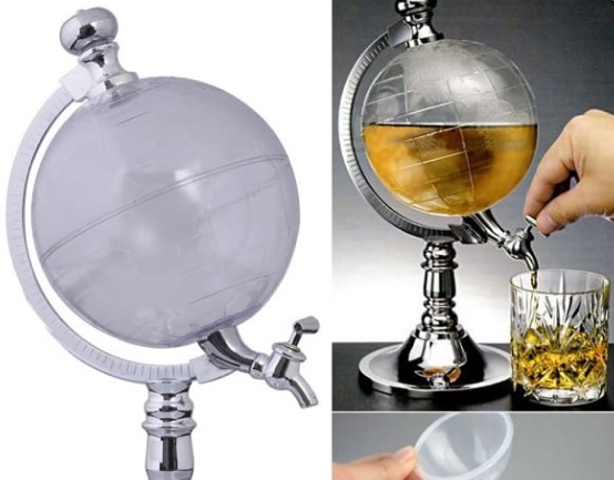 Le distributeur en forme de globe semble inhabituel et amusant. Une telle chose peut être présentée à une personne qui a une imagination illimitée et un sens de l'humour. Le boîtier en plastique a la forme d'un globe géographique. Le récipient contient 3,5 litres de boisson et est équipé d'un robinet de distribution. Un entonnoir est inclus pour un versement facile.