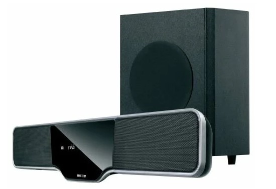 Home cinéma en plastique dans un boîtier noir avec karaoké, équipé d'un égaliseur. Vous pouvez régler les timbres de HF/LF, écouter la radio (FM). L'appareil prend en charge DLNA