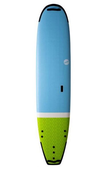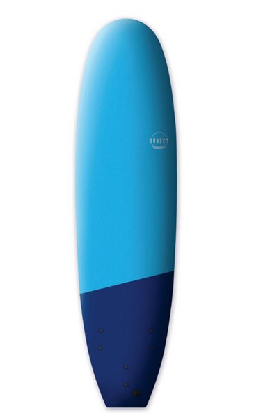 Ceci est un tutoriel de planche de surf. Il est utilisé par les loueurs de matériel nautique et les écoles de surf. La planche se caractérise par une forme large et plate avec un nez arrondi. Le point d'équilibre est marqué d'une image graphique sur la face avant. Il y a des poignées pour un transport facile.