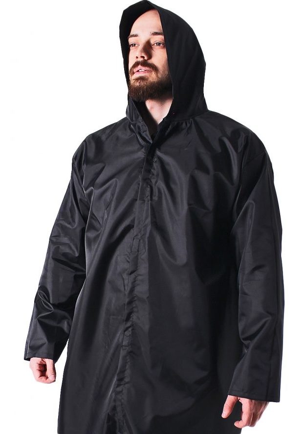 Un nom étrange pour les vêtements, mais la chose n'est pas mauvaise. Tissu - chlorure de polyvinyle avec imprégnation de silicone. Il y a quelques poches pour que vous puissiez mettre les mêmes clés, portefeuille ou téléphone. La capuche est petite, avec une visière cousue, une fermeture éclair.