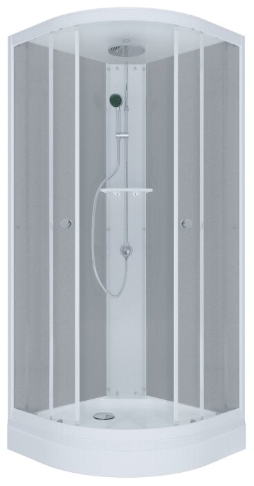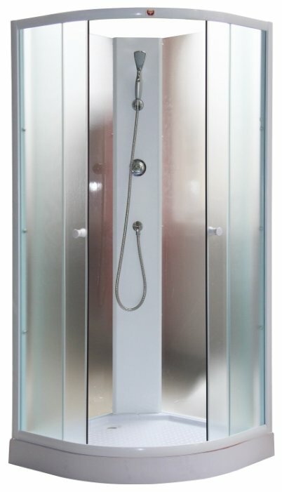 Le plateau a la forme d'un quart de cercle. S'intègre parfaitement dans un coin si nécessaire. Hauteur - 180 cm C'est un avantage pour l'installation dans des pièces à plafond bas, de petites maisons de campagne, dans des chalets d'été, dans des bains. Mais cette taille n'est pas destinée aux personnes de grande taille. Les portes coulissantes sont en verre ondulé dépoli.