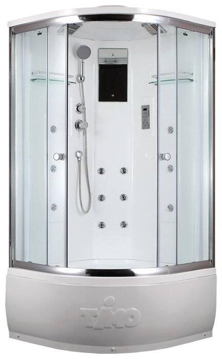 Le fabricant finlandais présente l'un des modèles fonctionnels et coûteux. La taille de la palette est un quart de cercle. La hauteur totale de la boîte est de 225 cm, les parois et les deux portes sont en verre résistant aux chocs de 6 mm d'épaisseur. Deux rouleaux pour une ouverture douce et facile. Plateau en acrylique européen de haute qualité avec revêtement antibactérien, hauteur 48 cm Paroi arrière monolithique en acrylique. L'électronique de cabine vous permet de vous détendre au maximum. Depuis le panneau de commande tactile, vous pouvez configurer une douche hydromassante avec 12 jets pour le dos et le corps, une douche à effet pluie, la radio, la ventilation, l'éclairage au plafond. À l'intérieur, il y a un siège pour des procédures confortables. Il y a un miroir et deux étagères. Le robinet de signature Timo a quatre modes de commutation du système de douche. De plus, vous pouvez connecter un bain turc.