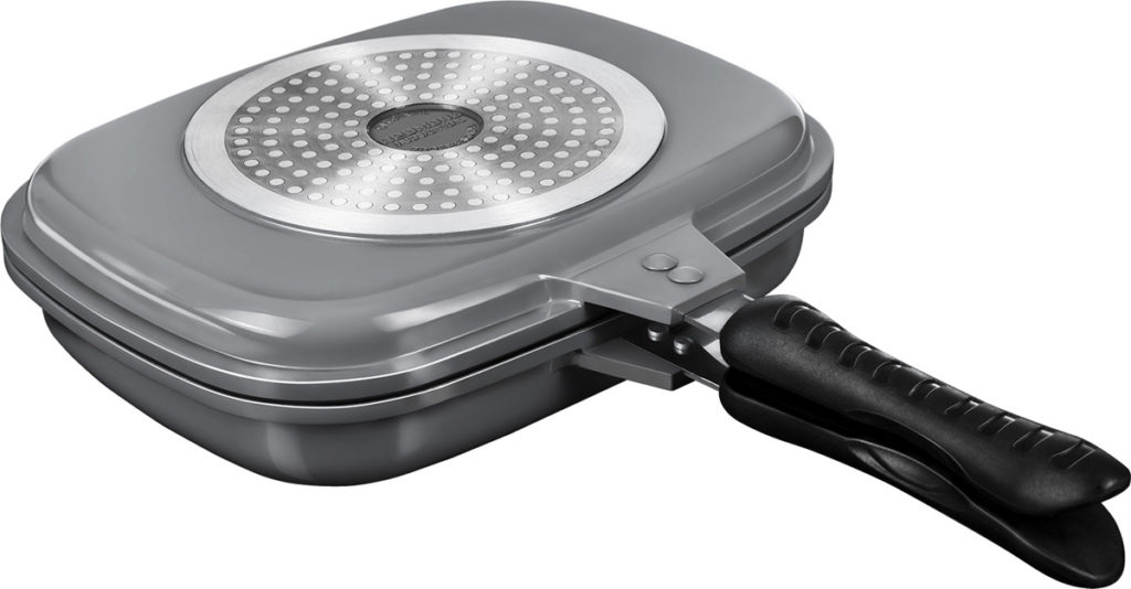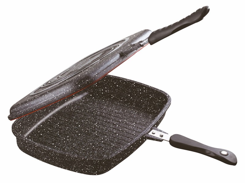 Le fabricant a utilisé la fonte d'aluminium comme matériau pour la fabrication d'une poêle à griller à double face. Équipé d'un revêtement antiadhésif à trois couches et d'un rebord en silicone. La technologie empêche la propagation des odeurs et maintient la chaleur à l'intérieur du brasier. Le revêtement en granit exclut un fort degré de torréfaction si l'hôtesse cuisine des aliments sans huile. Les poignées magnétiques en bakélite résistantes à la chaleur maintiennent deux casseroles en toute sécurité en position fermée.