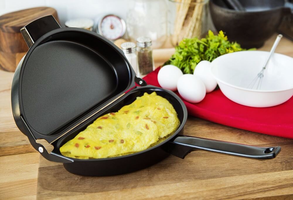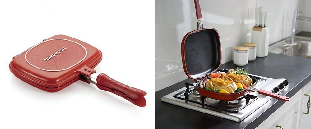 Le design se compose de deux poêles à frire identiques qui s'ouvrent sur le principe d'une coquille de rivière. La commodité est que les aliments n'ont pas besoin d'être mélangés avec une spatule. La casserole se retourne simplement sur le brûleur à gaz avec l'autre côté.