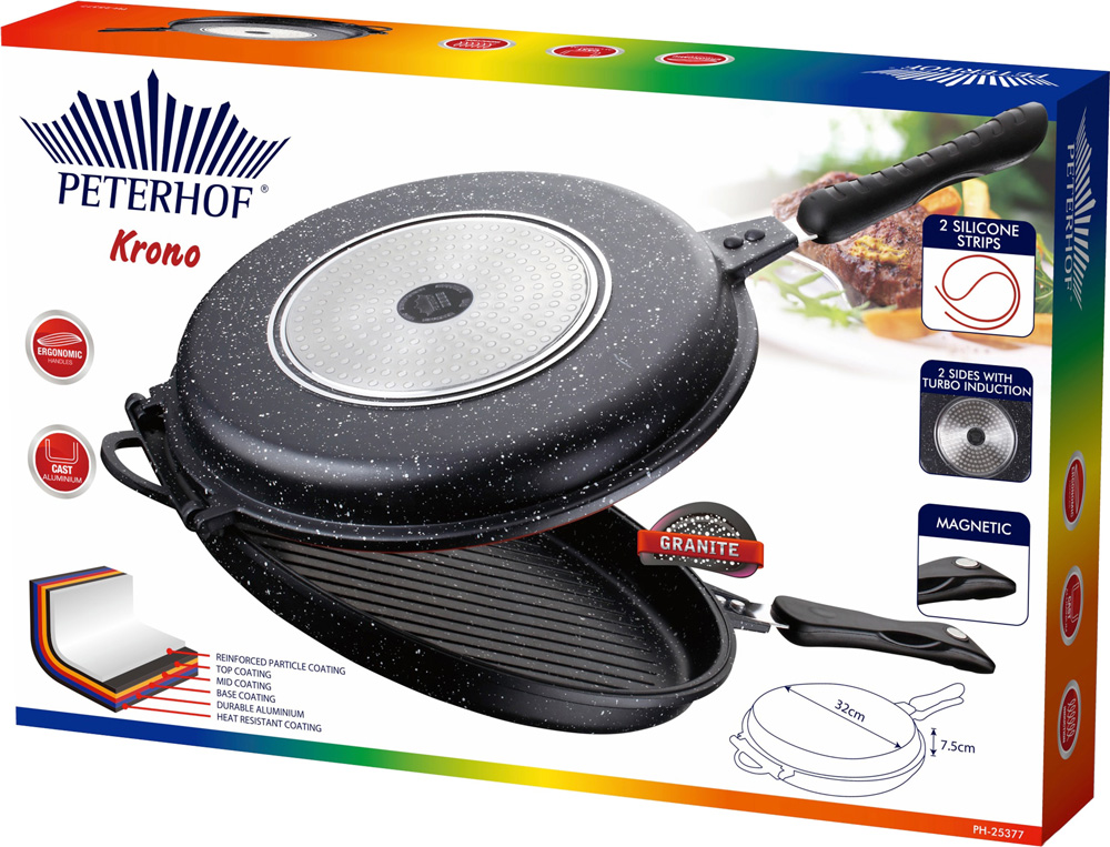 Appareil de cuisine universel adapté à différents types de surfaces : fours électriques, à induction et à gaz. Selon de nombreux indicateurs positifs, la marque Peterhof propose une poêle à frire améliorée. Grâce au revêtement en granit et à la fonte d'aluminium dont il est fait, les ingrédients ne s'attardent pas sur les côtés et le fond reste propre.