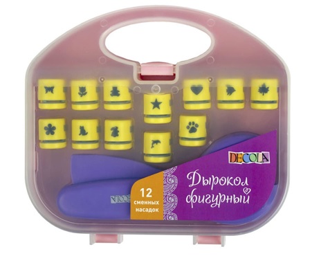 Pour réaliser des motifs complexes, une perforatrice figurée Decola est utilisée. L'ensemble comprend 12 buses différentes qui découpent des cœurs, des feuilles, des fleurs, des papillons, des silhouettes d'animaux. Pour obtenir un motif, insérez une buse adaptée, placez du papier dans la rainure, appuyez sur le levier. Le matériau de la lame est en métal, le corps est en plastique. Pour que le perforateur figuré fonctionne longtemps sans interruption, il est recommandé de lubrifier régulièrement la lame et de l'affûter en compostant du papier de verre fin.