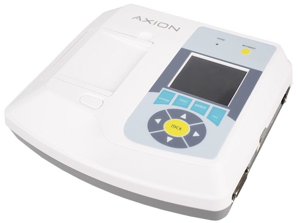 Électrocardiographe du fabricant russe "Axion" avec la possibilité d'enregistrer simultanément de 1 à 3 dérivations. L'appareil est équipé d'un écran LCD couleur mesurant 58 par 43 mm (diagonale 2,8 ''), dans lequel vous pouvez modifier la luminosité du rétroéclairage. Pour obtenir les mesures les plus précises, l'appareil dispose de filtres anti-tremblement, anti-dérive et notch.Il existe 2 modes de fonctionnement : automatique et manuel. Le cardiographe fixe la fréquence cardiaque dans la plage de 30 à 300 battements / min. En plus de construire des cardiocycles typiques, il est possible de construire un rythmogramme, un histogramme et un diagramme de dispersion. L'appareil enregistre automatiquement l'arythmie et détermine également la présence d'un stimulateur cardiaque. La conclusion du cardiogramme est réalisée à l'aide de l'imprimante thermique intégrée à une vitesse de 25, 50, 5, 12,5 mm/s. La mémoire interne est suffisante pour enregistrer 500 ECG. Une connexion multimédia externe est possible. L'appareil fonctionne à la fois à partir d'un réseau et à partir de la batterie intégrée.