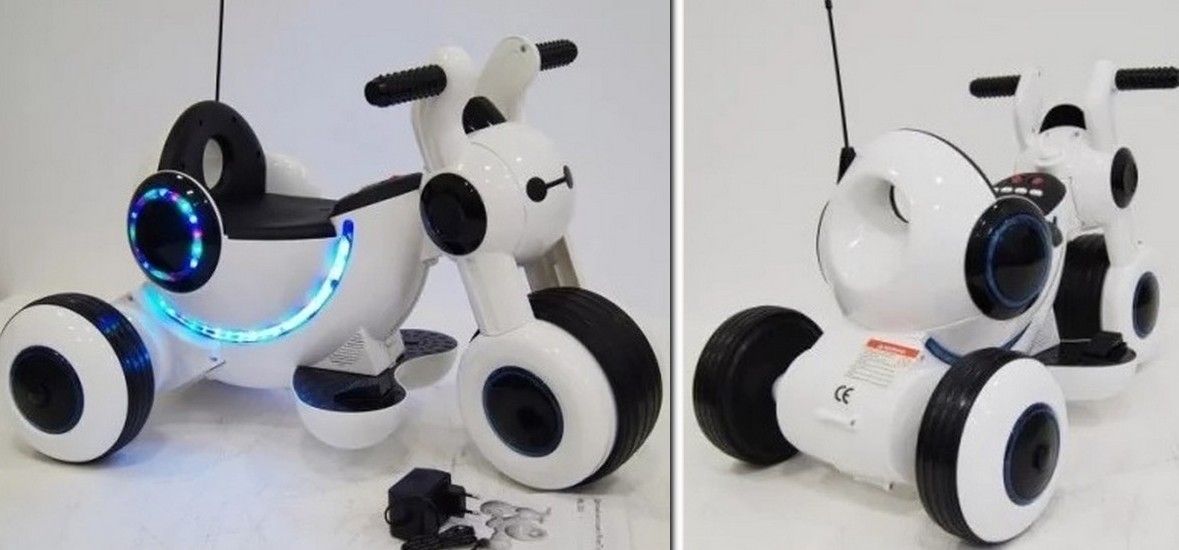 Une moto pour enfants sur 3 roues en blanc et noir a un design inhabituel, elle ressemble à un modèle adulte original d'un chopper urbain. Commencez par le bouton. Une seule roue tourne. Le design est équipé d'une boucle, de nombreux boutons et d'un rétroéclairage LED. Le corps est en plastique résistant aux chocs, les roues sont en caoutchouc.