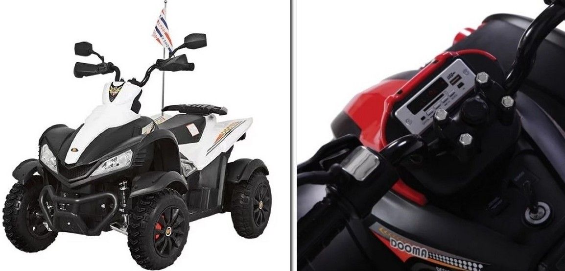 Un VTT électrique est utilisé pour rouler uniquement dans la rue, dans une maison ou un appartement, vous pouvez écouter de la musique dessus, grâce au support du MP3, de l'entrée USB et de la présence d'une radio (FM). La conception est équipée de deux pédales (pour l'accélérateur et le frein), de rétroviseurs et d'un système d'absorption des chocs, qui atténue les secousses lorsque les obstacles sont surmontés. Roues en matériau combiné: caoutchouc + plastique avec hautes "chenilles" et rainures, vous permettent de vous déplacer sur des routes asphaltées et en terre. L'équipement démarre avec une clé. Les phares lumineux vous permettent de faire fonctionner le VTT dans l'obscurité.
