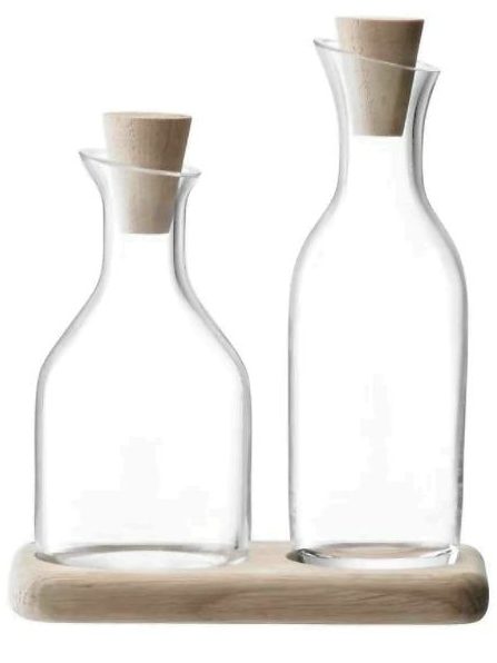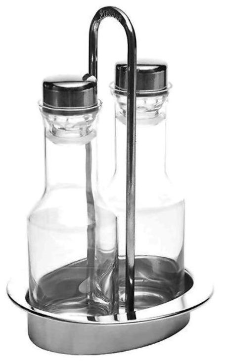 Un ensemble strict mais élégant de verre et de métal n'est pas une honte à mettre sur la table même dans un restaurant à la mode. Le diamètre des bouteilles est de 13,8 cm.L'acier inoxydable, à partir duquel le support et une partie des bouchons sont fabriqués, résiste aux rayures et aux effets de la température et conserve sa présentation pendant longtemps.