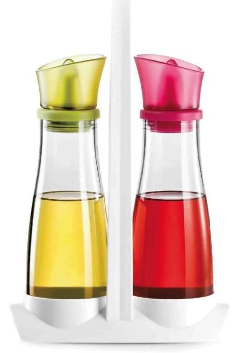 Deux récipients en verre borosilicaté sur un support pratique en plastique décoreront n'importe quelle cuisine. Les distributeurs sont fabriqués en plastique durable dans des couleurs vives. Le volume de chaque bouteille est de 250 ml. Toutes les autres épices liquides peuvent être stockées dans l'ensemble.