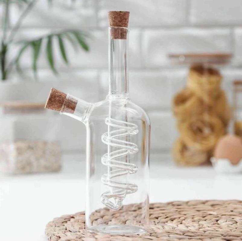 Une bouteille au design original aura fière allure non seulement sur une table à manger à la maison, mais également dans un restaurant coûteux. Le volume d'un grand récipient est de 250 ml, un petit situé derrière la spirale - 30 ml. La bouteille est en verre durable, le bouchon est en bois.